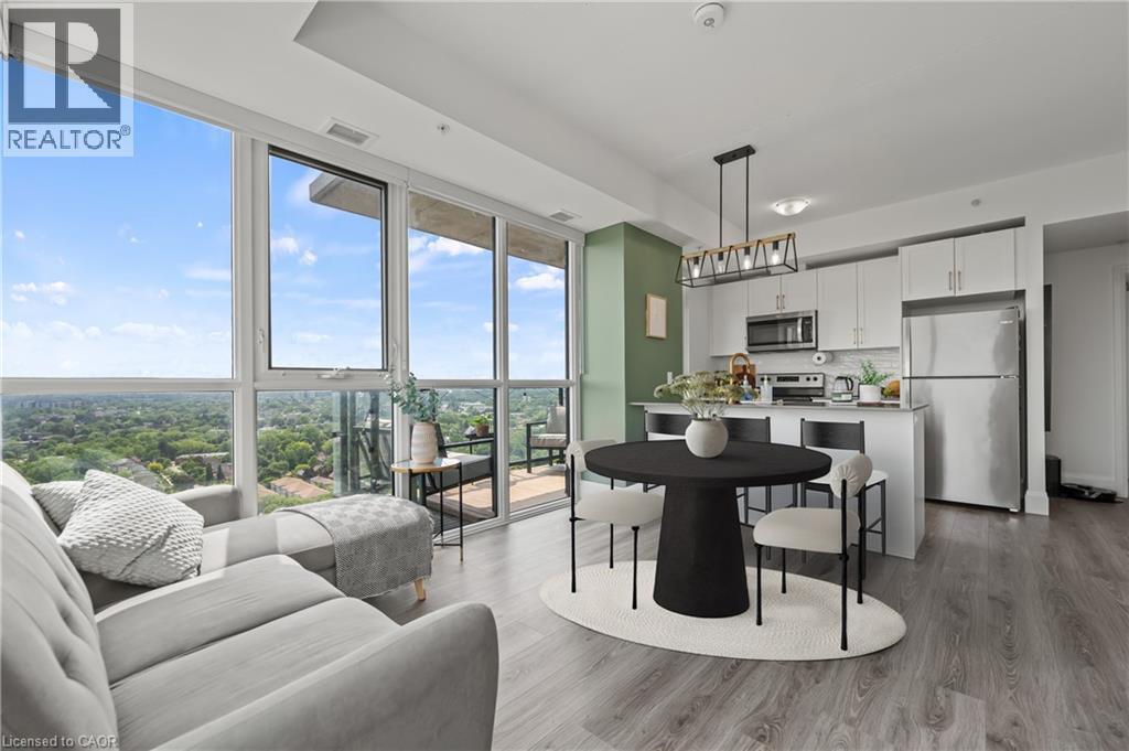 Luxury Corner Unit at Garment Street Condos-Experience elevated urban living in the heart of Kitchener’s Innovation District. This bright, south-facing corner unit offers 2 bedrooms, 2 bathrooms, a locker, and one underground parking space—perfectly blending style and convenience. Floor-to-ceiling windows and an open-concept layout flood the 811 SF space with natural light. The modern kitchen features quartz countertops, a breakfast bar, subway tile backsplash, and premium appliances, flowing seamlessly into the integrated dining area and living room. Step out onto your extra-wide private balcony and take in panoramic city views. The spacious primary suite boasts a walk-in closet and a stylish 3-piece ensuite, while the second bedroom and full 4-piece bath provide flexibility for guests or a home office. Laminate flooring and in-suite laundry add to the move-in-ready appeal. Garment Street Condos offers exceptional amenities: rooftop pool, fitness centre, yoga studio, basketball court, BBQ terrace, co-working spaces, media room, pet run, concierge service—and high-speed internet is included in the condo fees. Situated just steps from top employers like Google’s Canadian HQ, Communitech, Miovision, Vidyard, D2L, and ApplyBoard, and minutes to the University of Waterloo’s Pharmacy School and new School of Medicine, this location is unmatched for professionals and investors alike. Walk to Victoria Park, the LRT Central Station, the GO Train, and downtown Kitchener’s top restaurants, cafes, breweries, and boutiques. Whether you're a professional, investor, or seeking low-maintenance luxury, this is the one. Live where tech, culture, and convenience meet—book your private showing today! (id:6289)