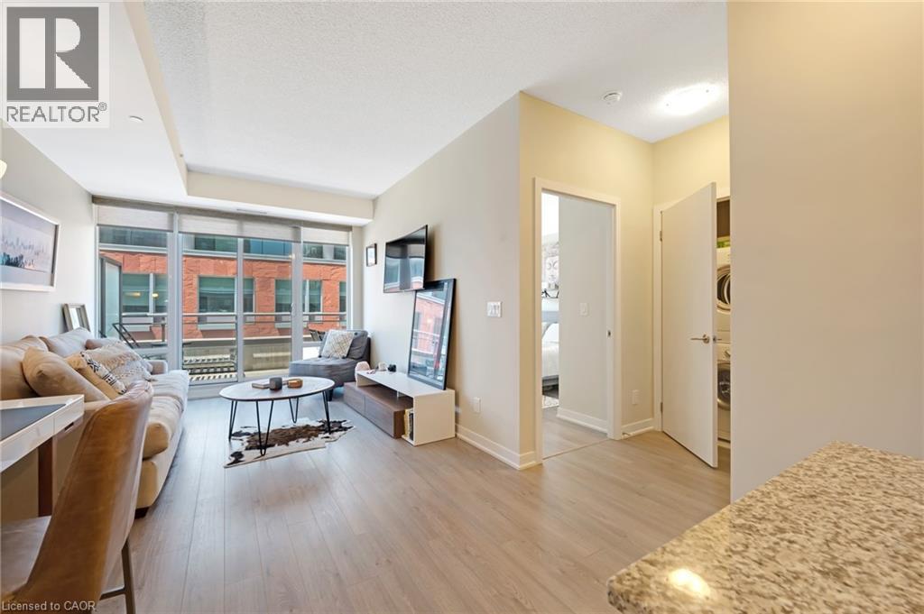 Welcome to Unit 214 at 85 Duke Street, located in the heart of downtown Kitchener. This bright and modern 1-bedroom, 1-bathroom condo features an open-concept layout combining the kitchen, dining, and living areas, providing a functional space for daily living. The kitchen is equipped with appliances and offers ample counter and storage space. The bedroom includes generous closet space, and the 4-piece bathroom has a clean, contemporary design. Additional features include in-suite laundry and an underground parking space. Residents have access to building amenities such as a community BBQ, concierge, exercise room, gym, and party/meeting room. Situated close to the LRT, restaurants, shopping, and tech offices. (id:6289)