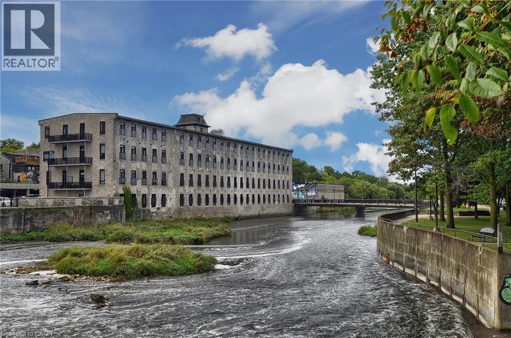 Discover boutique living at its finest in this exquisite 2-storey condo at Riverbank Lofts, an iconic building conversion in the heart of historic downtown Hespeler. Originally built in 1847 by Jacob Hespeler, this remarkable property blends timeless heritage with sophisticated modern design, all set along the tranquil banks of the Speed River. From the moment you enter, you’ll be captivated by the soaring ceilings, dramatic oversized windows, and authentic wood beams that preserve the building’s character, while natural light and river views create a serene backdrop. The open-concept living space is anchored by a custom built-in entertainment wall with electric fireplace perfect for cozy evenings in. The chef-inspired kitchen is a true showpiece, with sleek quartz countertops, upgraded appliances, and a hidden pantry cleverly tucked beneath the staircase. Juliette balconies throughout lend an elegant, European feel, while a stylish powder room adds convenience on the main floor. Upstairs, a striking catwalk connects two private bedroom retreats. Each suite offers its own spa-like ensuite and sliding barn doors for a touch of rustic charm. The primary suite impresses with custom built-ins, sound-dampening curtains, and a beautifully designed walk-in closet. The second bedroom is equally versatile with integrated storage and desk space, making it ideal for guests or a home office. This boutique residence includes two parking spaces and access to curated amenities, including three chic lounges, a fitness centre, bike storage, and even a dog wash station. All of this just steps from the artisan cafés, boutique shops, scenic parks, and riverside paths of downtown Hespeler Village. A truly unique offering, this home captures the essence of boutique urban living in a historic riverside setting. (id:6289)