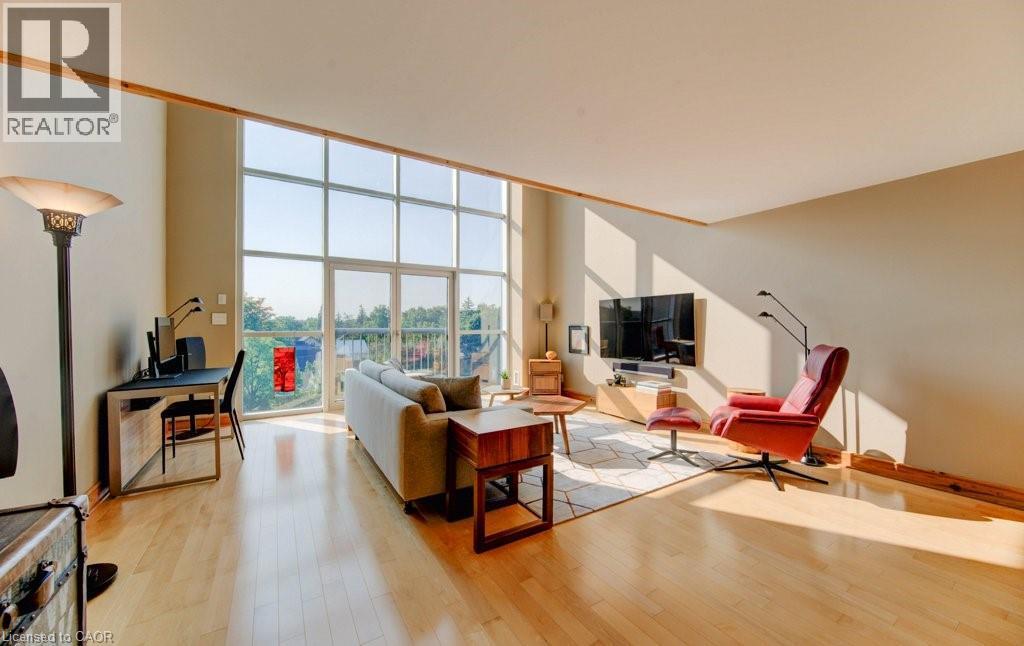 Experience the condo lifestyle at Seagram Lofts.  You can't beat this prime location in Uptown Waterloo.  Close to the ION light rail minutes away and a biker's paradise.  Redeveloped whisky barrel warehouses & industrial architecture combine with high ceilings, original brick walls, barrel wood doors, polished concrete floors, and distinctive full height windows.  Two elevators, a fitness room, games room, guest suite, basement locker, large roof top garden & sitting area plus a community BBQ are among the many amenities.  Unit 408 has a desired location at the back of the building with insuite laundry, garage parking plus an exclusive locker. The two story windows enhance the seasonal scenic views.  Remote controlled blackout & screen blinds adjust light and a Juliet balcony opens to allow fall breezes during sunny days.  Numerous updates have been completed by the long-term owners blending modern renovations with timeless character.  Light hardwood floors provide a carpet free main floor.  Professional renovations to the kitchen and bathrooms are notable.  The thoughtful details expand to the addition of numerous dimmable ceiling LED potlights on both levels.  The primary bedroom space includes the upper loft view and dual drapery rail for bedroom privacy at night. A walk-in closet plus stackable laundry closet & 4 pc ensuite complete this level.  The main floor office is versatile as a guest room or den.  The kitchen includes maple shaker soft close cabinetry, designated spice drawer, 2 corner Lazy Susan pull outs, granite counters, wine rack, glass tile backsplash, new Café induction range (2025), plus more.  A high efficiency furnace was added in 2024.  Network cables can be found in walls for full wiring to living room, den & upper level.  Beautifully maintained and updated. Walk, bike or drive to the University of Waterloo & Wilfrid Laurier University. Make your next move to the Seagram Lofts! (id:6289)
