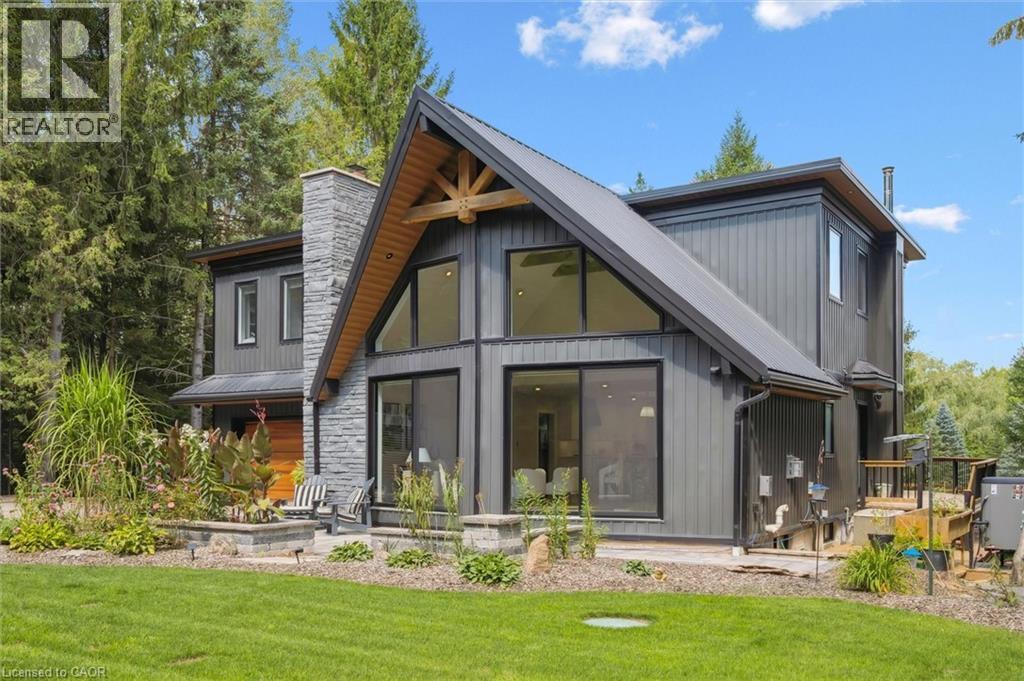 Private Oasis in Waterloo. This one-of-a-kind, fully renovated home offers a cottage-like retreat just minutes from city amenities. Set on 3.7 acres surrounded by trees, a pond, and nature, it combines luxury finishes with smart home technology to create a truly signature property. Inside, the open-concept living room features soaring vaulted ceilings, a propane fireplace, and expansive windows that flood the space with natural light. The chef’s kitchen boasts quartz counters, a spacious island, high-end appliances, pot filler, custom backsplash, and an adjoining pantry with built-in microwave, additional oven, fridge, wine rack, and storage. Perfect for entertaining, the main floor also includes a stylish dining area, built-in bar, walkout to a deck with power awning, and a 4-pc bath. Upstairs, the primary suite is a private sanctuary with breathtaking views, a large walk-in closet, and a spa-like 5-pc ensuite featuring a soaker tub, glass shower, and double sinks. Two additional bedrooms, a 3-pc bath, and convenient upper-level laundry complete this floor. The finished lower level includes heated tile floors, a rec room with cozy wood fireplace and walkout, rough-in for a wet bar, an additional bedroom, office with separate entrance, and a 3-pc bath.The mechanical features include updated electrical & plumbing, Lennox heat pump with backup propane furnace, R/O system and new carbon filter for drilled well, new septic system, solar panels on flat roof generate electricity. Smart home features throughout. Outside, enjoy a private front yard, secondary driveway which allows extra parking, a large patio overlooking the pond with sandy beach and floating dock, plus two charming bunkies—one with a wood stove. All of this within minutes to shopping, schools, markets, and trails. A+++ (id:6289)