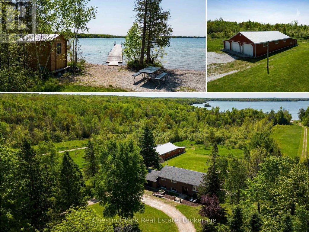 This stunning 6.5-acre waterfront estate offers the perfect blend of space, serenity, and opportunity. Tucked along a circular lane, the updated brick raised bungalow with 2347 sqft of finished living space features a walk-out basement, double attached garage, a showstopping 3,760 sq ft red barn and private beach- perfect for hobby farm with a couple horses or family retreat! Step inside to a welcoming foyer with soaring ceiling and hardwood floors that flow throughout the spacious, light-filled home. The warm and elegant living room, complete with a handsome gas fireplace connects seamlessly to a formal dining area and charming, country-style kitchen -the heart of the home. With room for a harvest table, ample cabinetry, and generous counter space, it's perfect for gathering family and friends. French doors open to a large deck with peaceful views of the barn, trees, and glistening water beyond. Three well-proportioned bedrooms offer ample closet space and a beautifully appointed 5-piece main bath complete the main floor. Downstairs, the walk-out lower level continues to impress with a spacious family/recreation room with two seating areas, warmed by a wood stove (2019), and French doors that open to a covered patio- plus two additional bedrooms, a second full bathroom, laundry, and interior garage access. The massive red barn (2006) boasts 4 heated horse stalls, concrete floors, storage, and endless space for your toys or events- many a barn dance has been held here! Follow the lane to your private waterfront paradise on pristine Berford Lake, part of the Great Lakes basin. Enjoy swimming, kayaking, and fishing from your approximately 140' of shoreline with clean rock/sand entry, private 112' dock, bunkie, play area, and a large firepit for unforgettable evenings. All just 15 minutes from the shops and restaurants of Wiarton in beautiful South Bruce Peninsula. An exceptional property with room to live, play, and dream-this is lakeside country living at its finest. (id:6289)