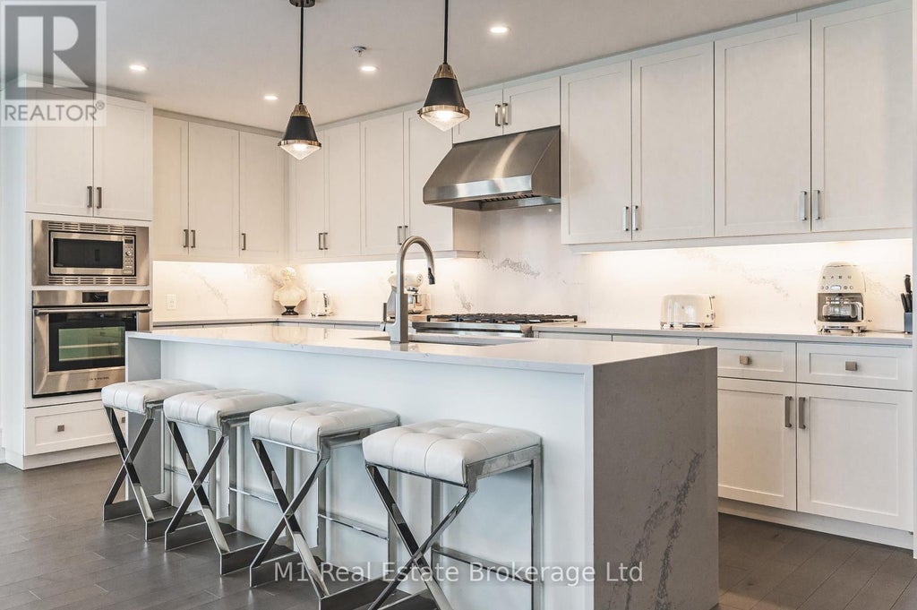 Experience one of Guelph's rarest condos; the most sought-after River Residence in the development. This condo offers 3,378 square feet of luxurious living space, including 1,111-square-feet of terrace with 110 feet of river frontage, promising a lifestyle of comfort and sophistication. Step into a grand foyer with coffered ceilings, setting a refined tone that continues throughout the home. The spacious living room, featuring a Dimplex electric fireplace and bathed in natural light from oversized windows, creates an inviting atmosphere for relaxation or entertaining. The gourmet kitchen is a chef's dream, equipped with top-of-the-line stainless steel Fisher & Paykel appliances, a 6-burner gas rangetop, wall-mount oven, sleek quartz countertops, shaker cabinets, and a waterfall island. The luxurious master ensuite boasts a decadent soaker tub, double sinks, and a basket weave mosaic shower floor, offering a spa-like retreat. The second bedroom features a walk-in closet for ample storage. Modern amenities include a Samsung stacked washer/dryer, Panasonic microwave, and pot lights in the dining and living areas. Elegant touches like brushed nickel door handles and 5" wide maple grey floorboards add sophistication. Three spacious terraces overlooking the river provide the perfect setting for alfresco dining or morning coffee with panoramic views. With three parking spaces, two heated storage lockers, and access to Metalworks Condominiums' exclusive amenities, including a speakeasy, this residence epitomizes luxury living in a prime location. (id:6289)