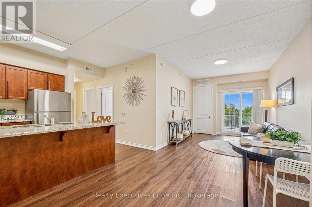 Move-in-ready 2-bedroom, 1-bathroom condo with 834 sq. ft. (IGuide). This bright, open-concept unit has 9-foot ceilings and vinyl flooring throughout-no carpet! The kitchen features granite countertops, stainless steel appliances, rich cabinets, and a breakfast bar. The dining area is next to the kitchen, and the sunny living room opens to a south-facing balcony with great views.Both bedrooms are spacious with closets, and the 4-piece bathroom includes a vanity and tub/shower combo. laundry closet (washer and dryer replaced in 2018). The unit also includes an owned underground parking spot, a locker on the same floor, and low condo fees that cover water.No rental items. Water heater owned. Close to the University of Guelph, and easy access to Hwy 401. Don't miss this stylish, affordable South End condo-book your showing today! (id:6289)